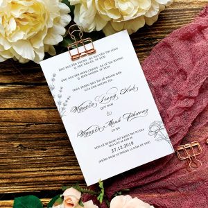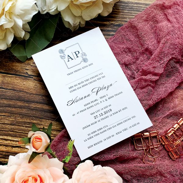 – Thiệp mời tiệc: 10 x 15 cm, quy cách in 1 mặt, chất liệu giấy mỹ thuật tiêu chuẩn.