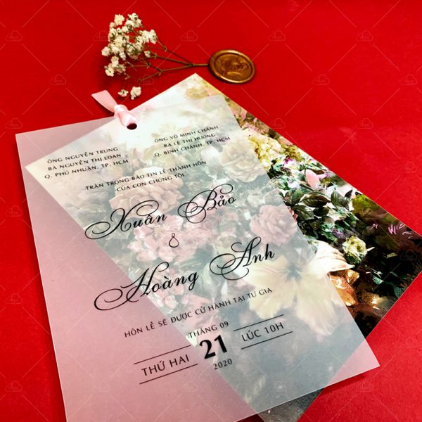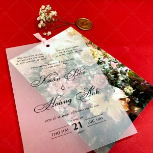 – Thiệp báo hỷ: 12 x 17 cm, quy cách in 1 mặt, khoét lỗ tròn, chất liệu giấy can trong.