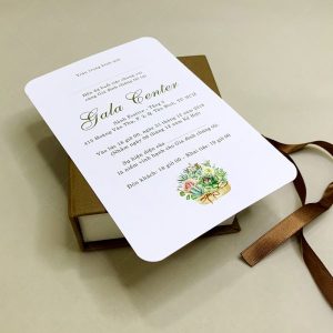 – Thiệp mời tiệc: 10 x 15 cm, quy cách in 1 mặt, bo tròn 4 góc, chất liệu giấy mỹ thuật tiêu chuẩn.