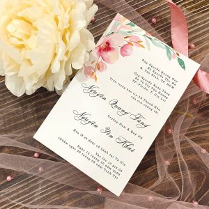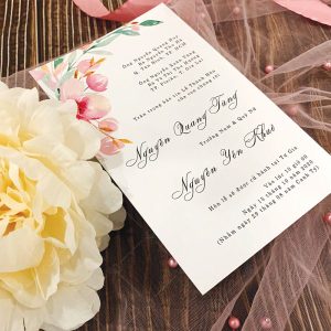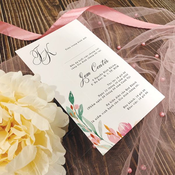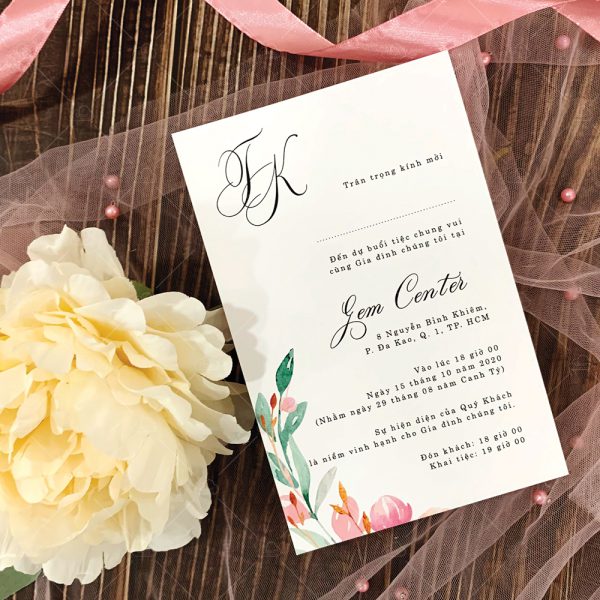 – Thiệp mời tiệc: 11 x 17 cm, quy cách in 1 mặt, chất liệu giấy mỹ thuật tiêu chuẩn.