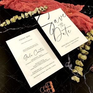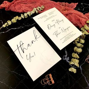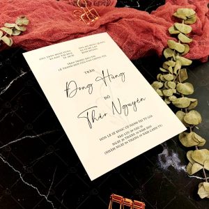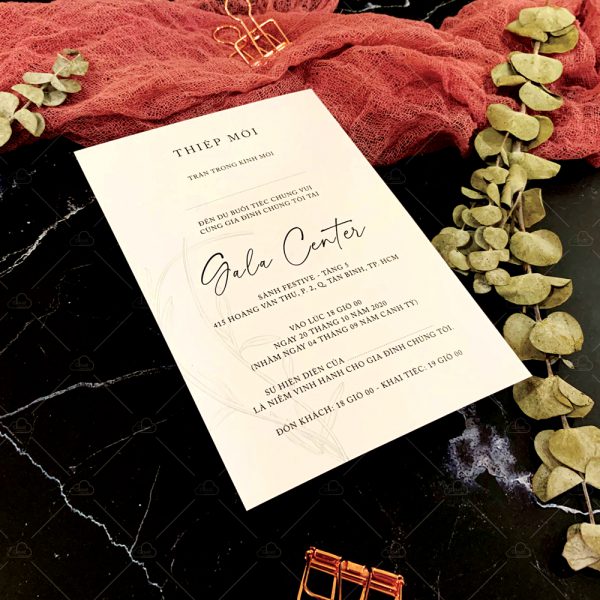 – Thiệp mời tiệc: 12 x 17 cm, quy cách in 2 mặt, chất liệu giấy mỹ thuật tiêu chuẩn.