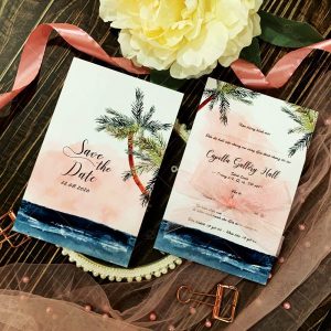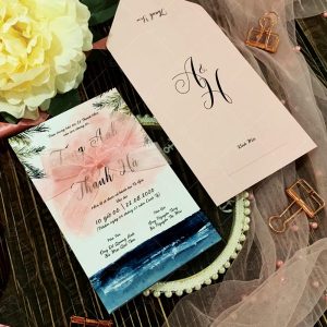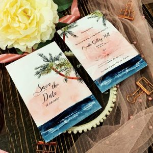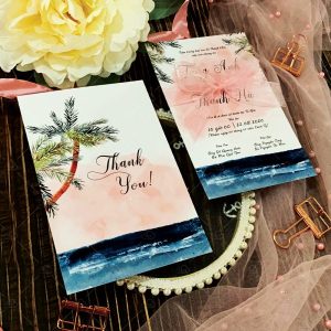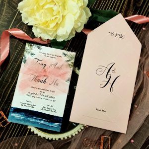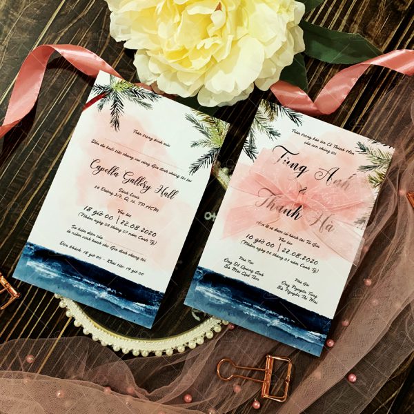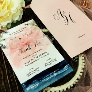– Thiệp mời tiệc: 11 x 17 cm, quy cách in 2 mặt, chất liệu giấy mỹ thuật tiêu chuẩn.