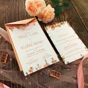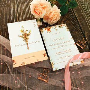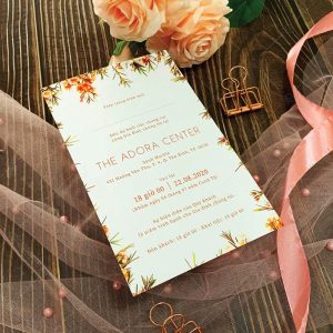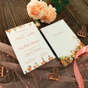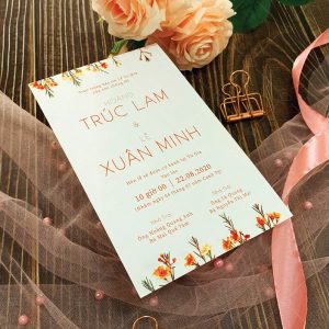 – Thiệp mời tiệc: 11 x 17 cm, quy cách in 2 mặt, chất liệu giấy mỹ thuật tiêu chuẩn.