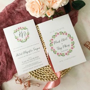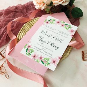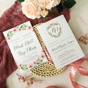 – Thiệp mời tiệc: 11 x 17 cm, quy cách in 2 mặt, chất liệu giấy mỹ thuật tiêu chuẩn.