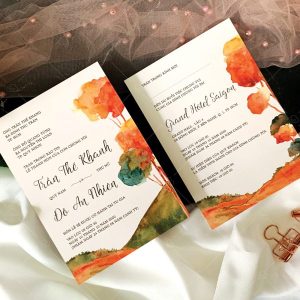 – Thiệp mời tiệc: 12 x 17 cm, quy cách in 1 mặt, chất liệu giấy mỹ thuật tiêu chuẩn.