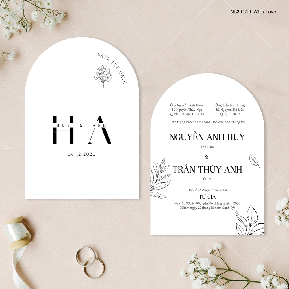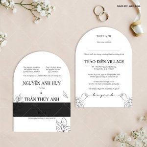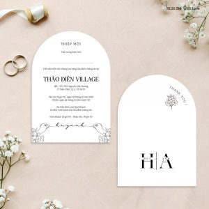 – Thiệp mời tiệc: 12 x 17 cm, quy cách in 2 mặt, bế bo tròn như hình, chất liệu giấy mỹ thuật tiêu chuẩn.