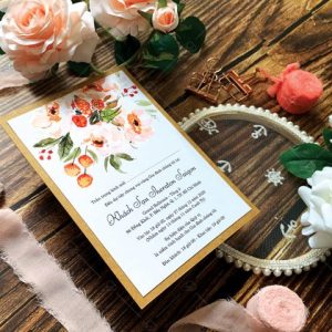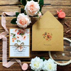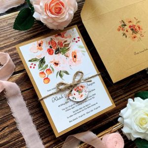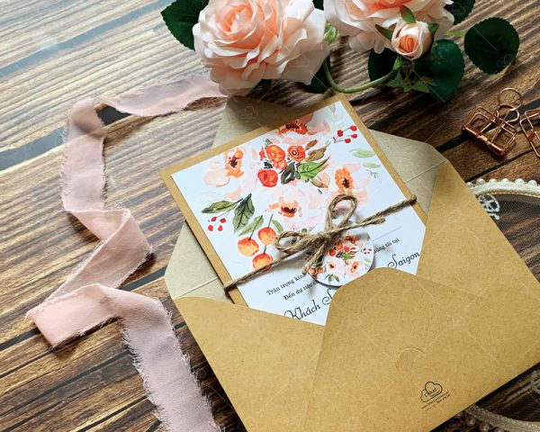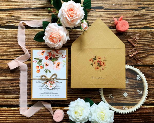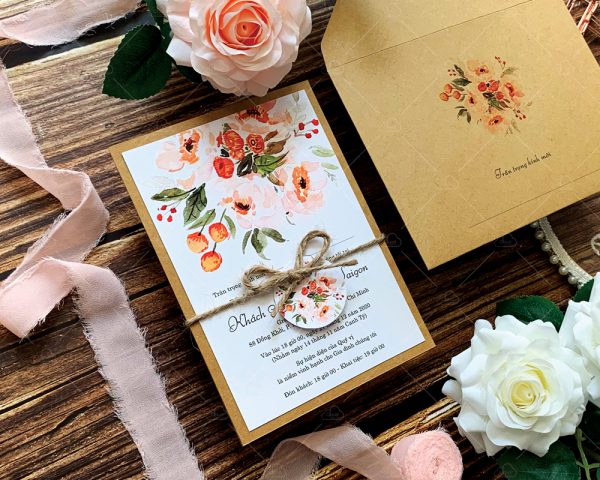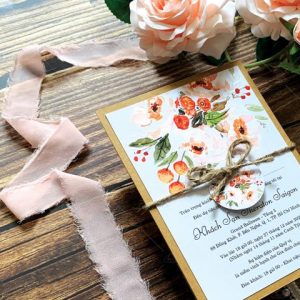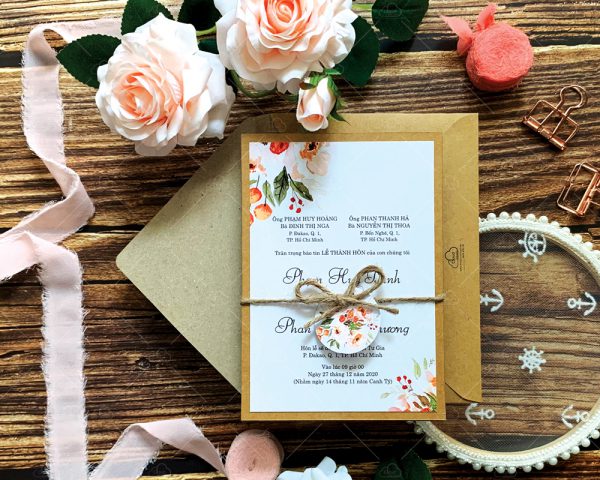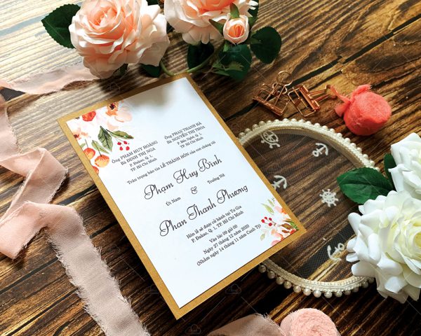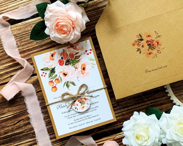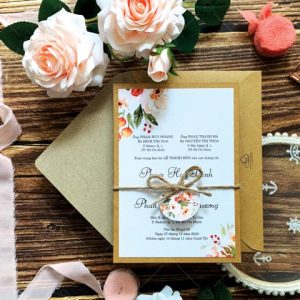 – Thiệp mời: Dán bồi giấy Kraft 2 mặt 12 x 17 cm, tờ báo hỷ quy cách in 1 mặt, chất liệu giấy mỹ thuật tiêu chuẩn.