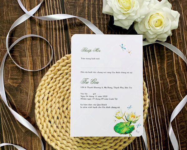 – Thiệp báo hỷ + mời tiệc: 12 x 17 cm, quy cách in 2 mặt, bo tròn 2 góc (như hình), chất liệu giấy mỹ thuật tiêu chuẩn.