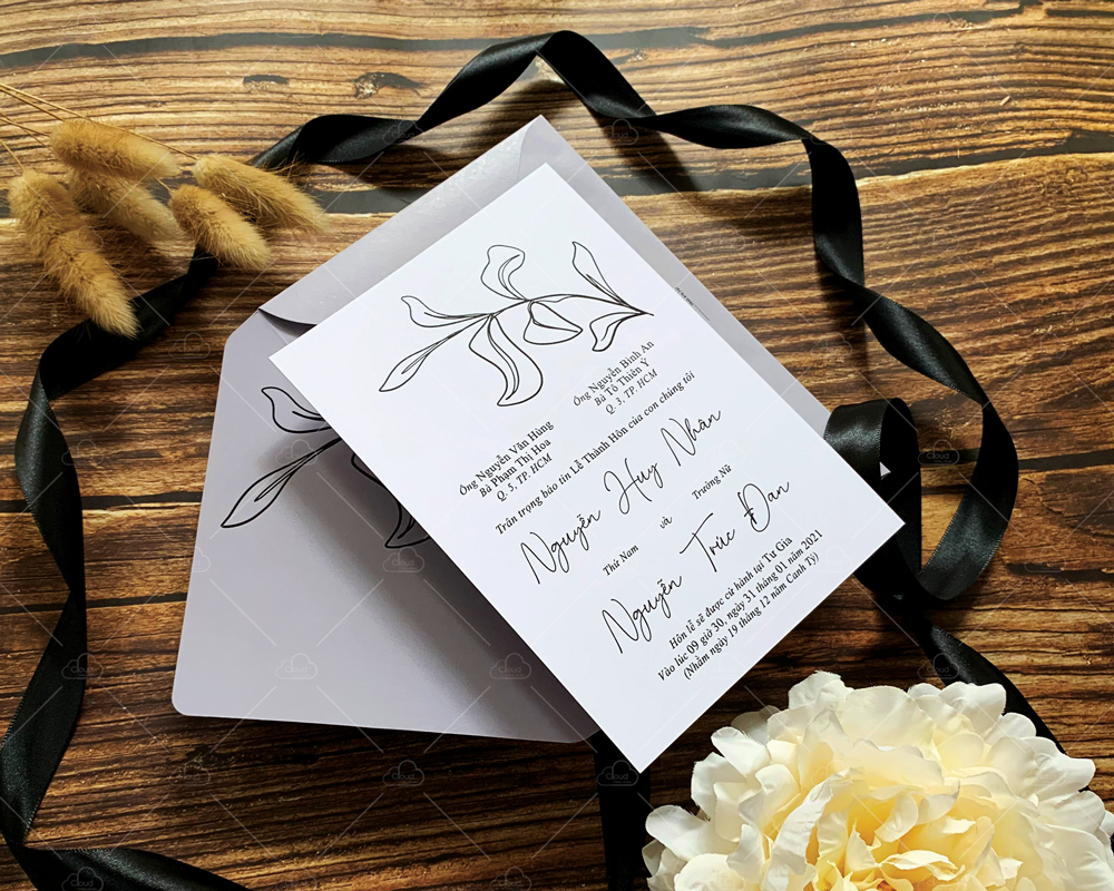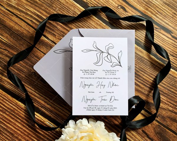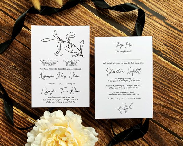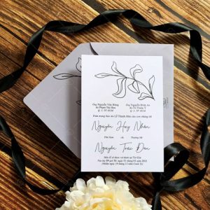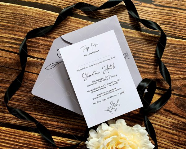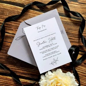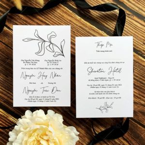 – Thiệp mời tiệc: 12 x 17 cm, quy cách in 2 mặt, chất liệu giấy mỹ thuật tiêu chuẩn.