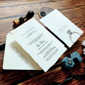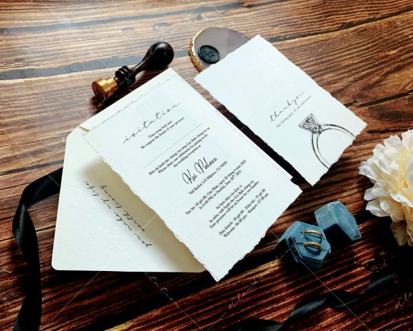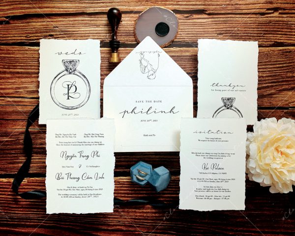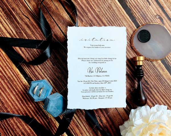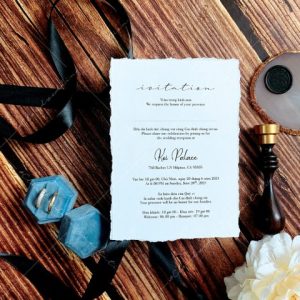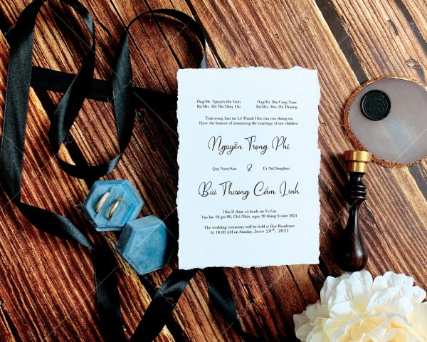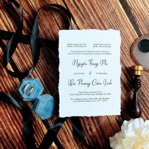 – Thiệp mời tiệc: 12 x 17 cm, quy cách in 2 mặt, chất liệu giấy mỹ thuật cao cấp. (xé viền thiệp)