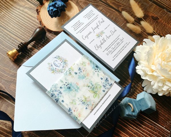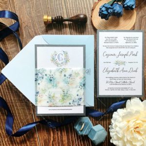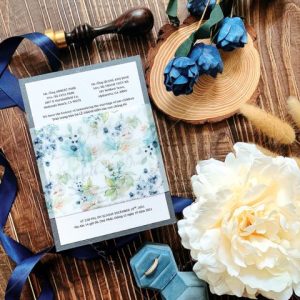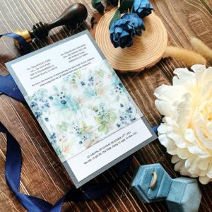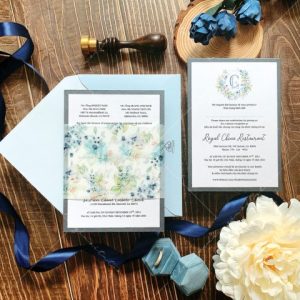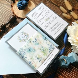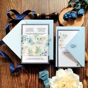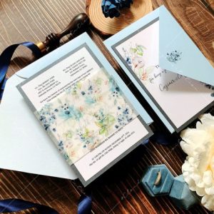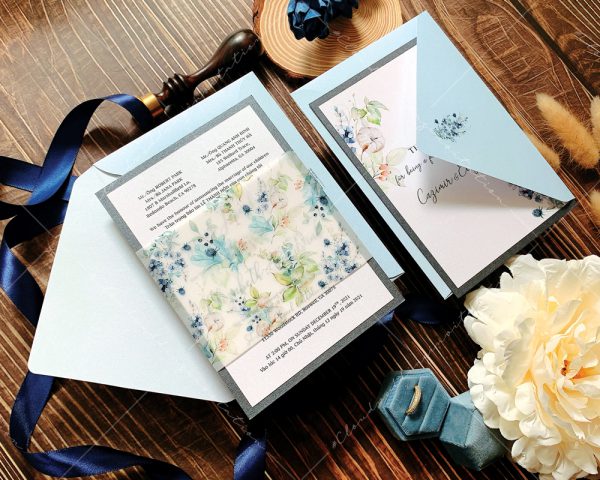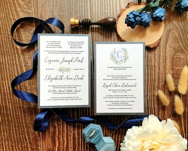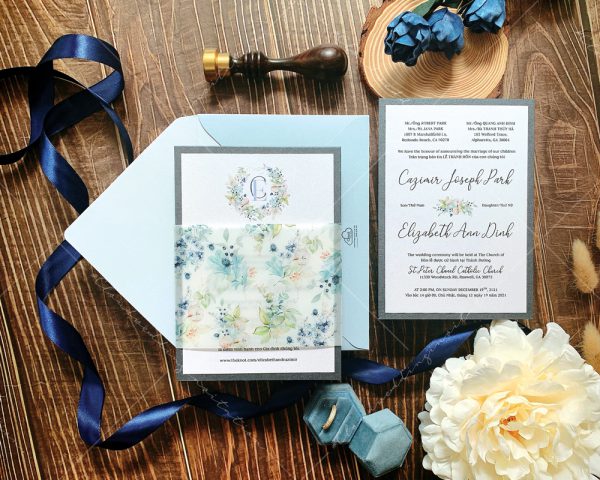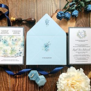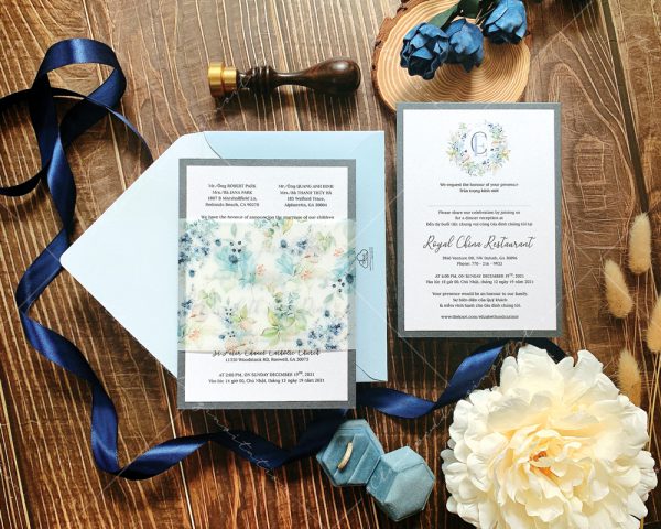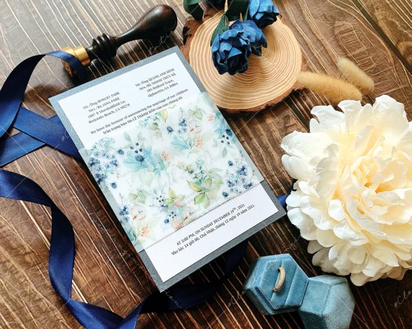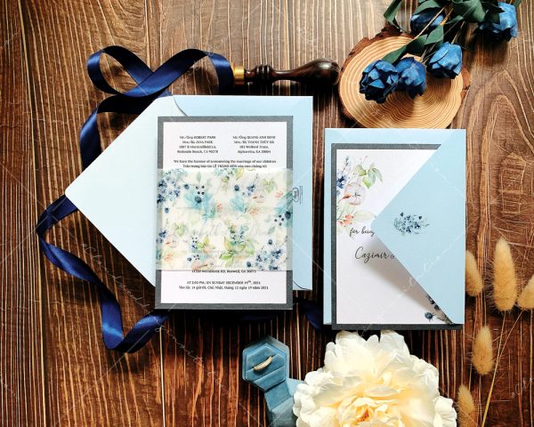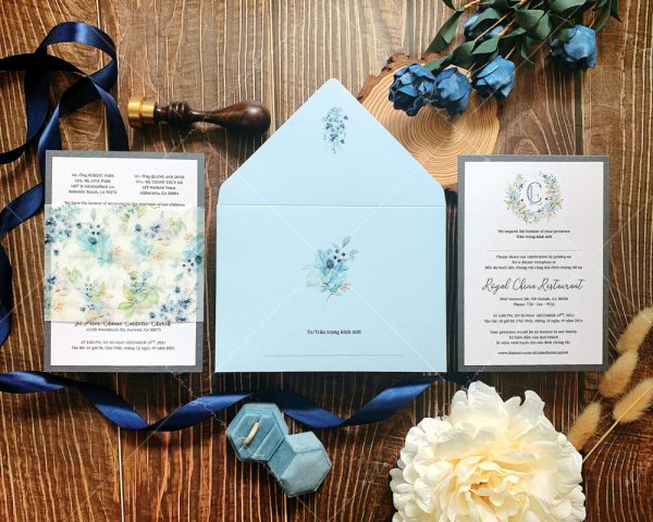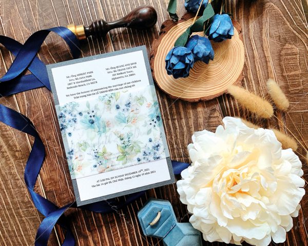 – Tờ thiệp mời: Dán bồi giấy mỹ thuật cao cấp 12 x 17 cm, tờ thiệp mời quy cách in 1 mặt, chất liệu giấy mỹ thuật cao cấp.