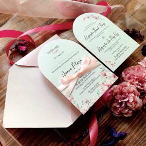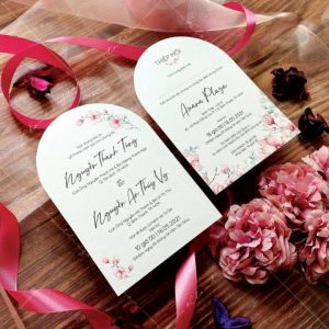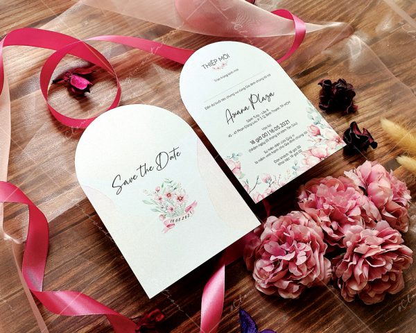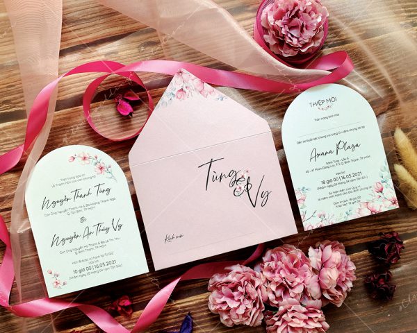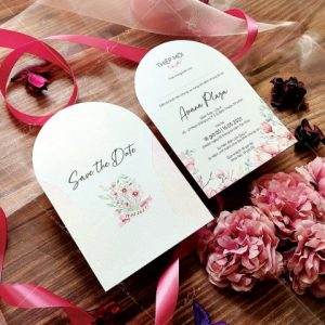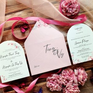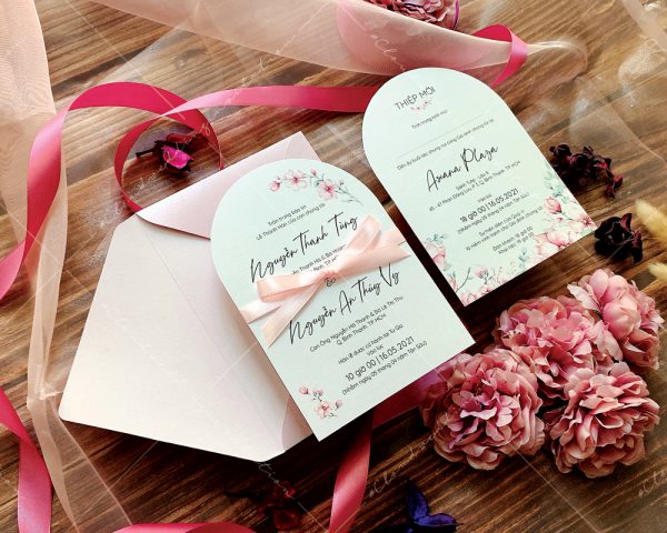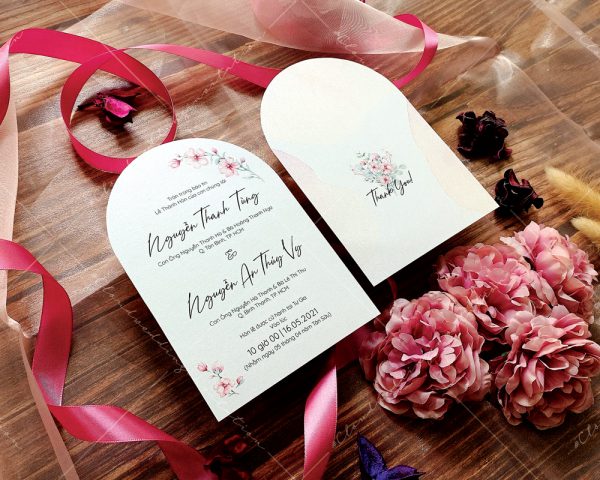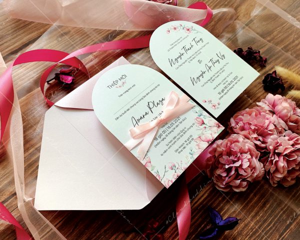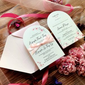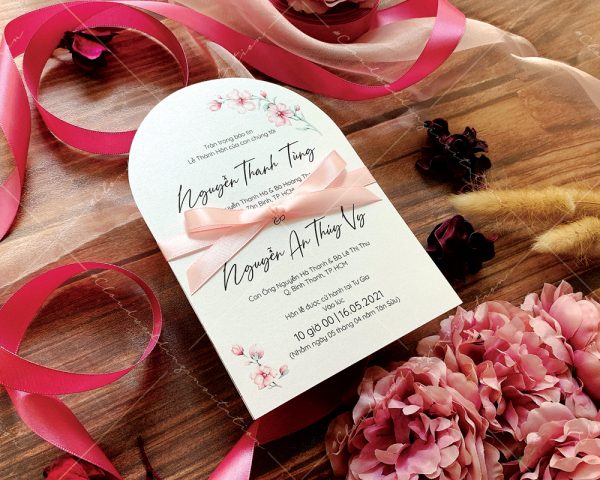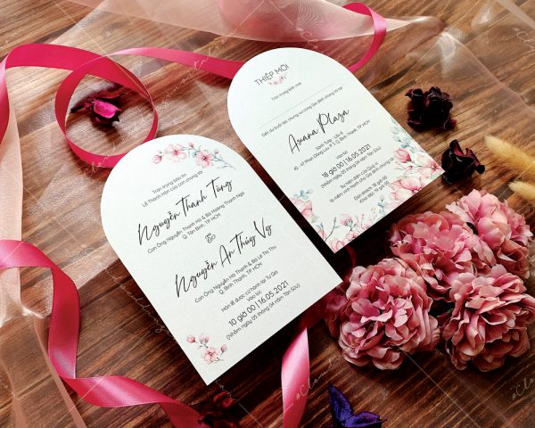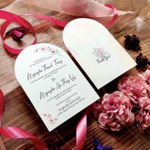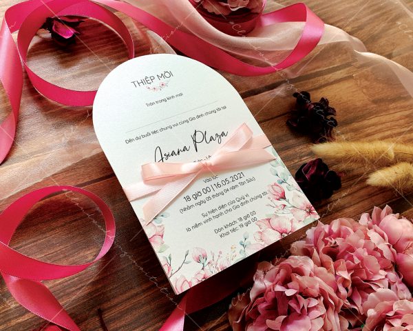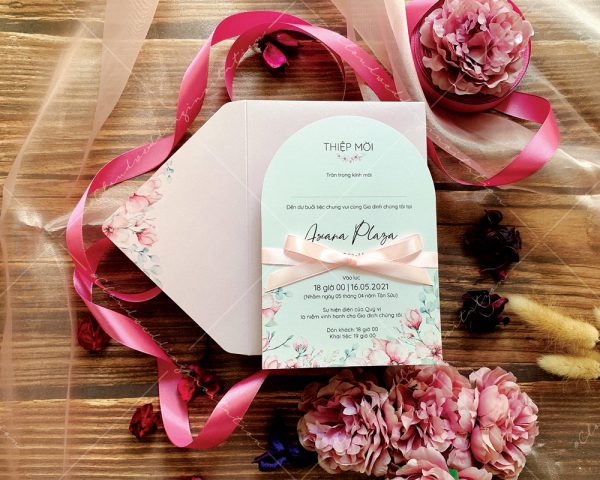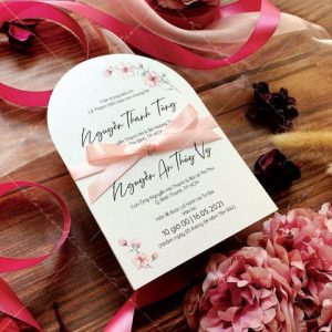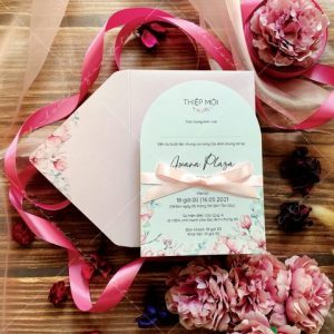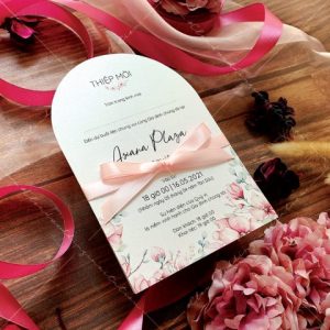 – Thiệp mời tiệc: 12 x 17 cm, quy cách in 2 mặt, bế bo tròn như hình, chất liệu giấy mỹ thuật cao cấp.