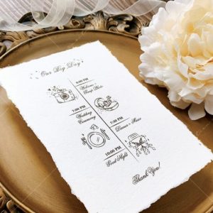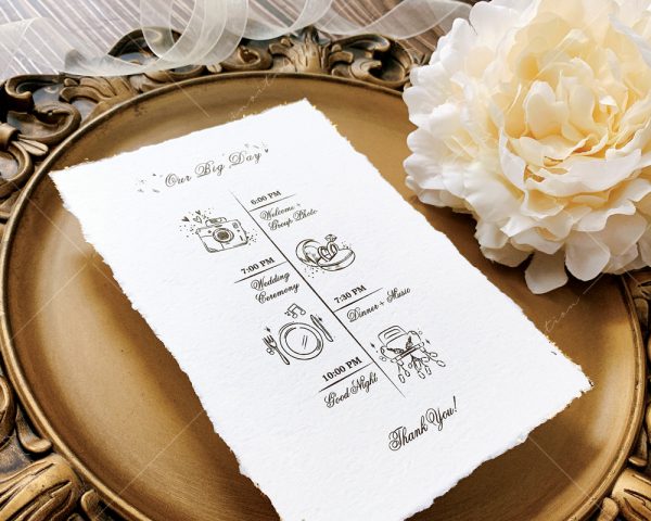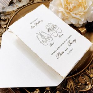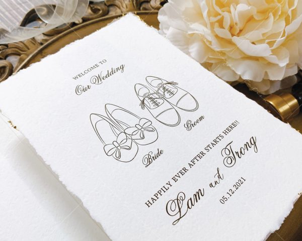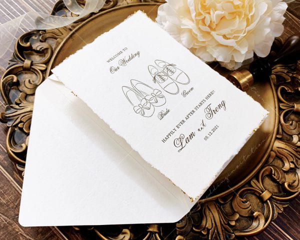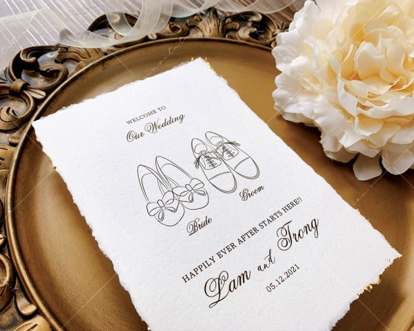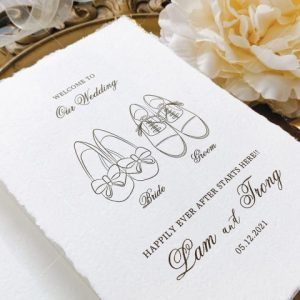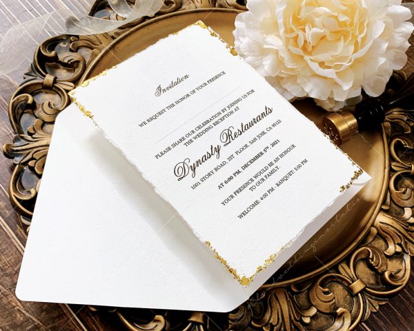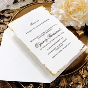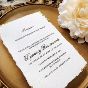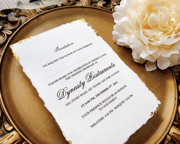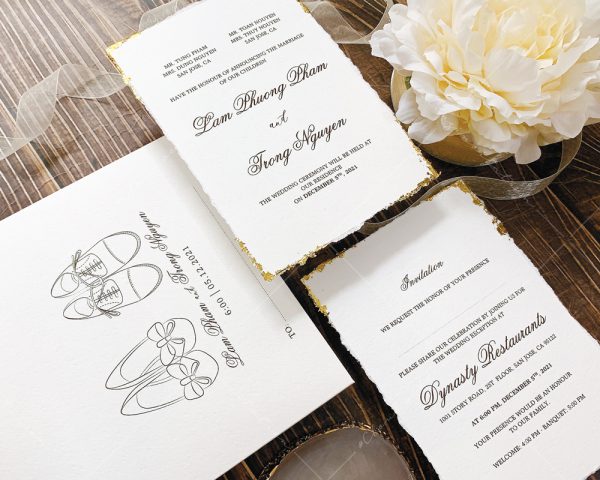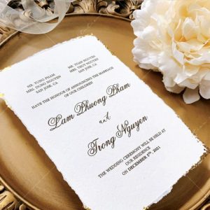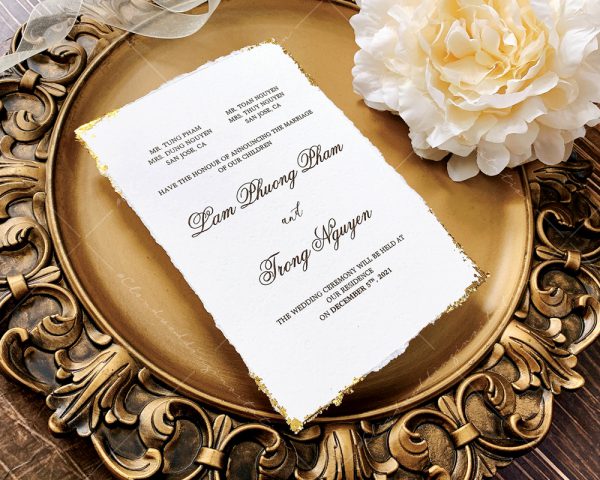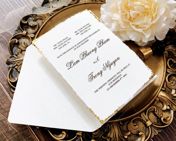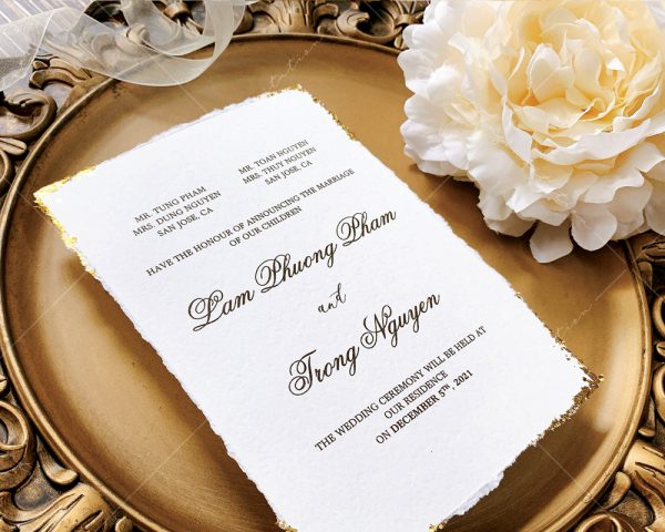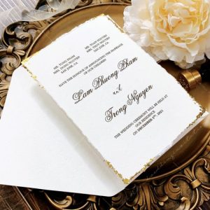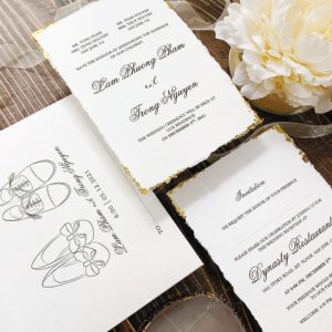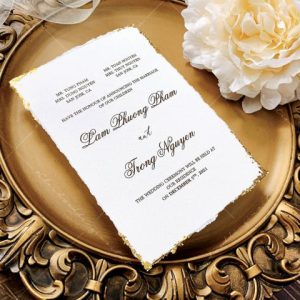 – Thiệp mời tiệc: 12 x 17 cm, quy cách in 2 mặt, chất liệu giấy mỹ thuật cao cấp. (xé viền thiệp và gia công nhũ màu gold 4 góc)