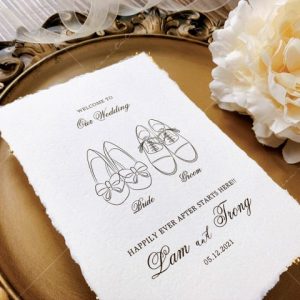 – Thiệp báo hỷ: 12 x 17 cm, quy cách in 2 mặt, chất liệu giấy mỹ thuật cao cấp. (xé viền thiệp và gia công nhũ màu gold 4 góc)