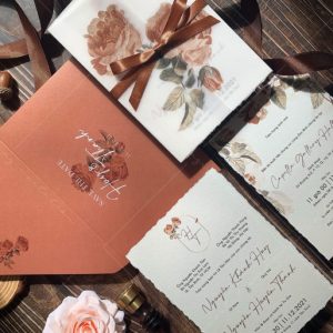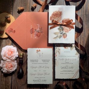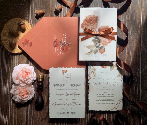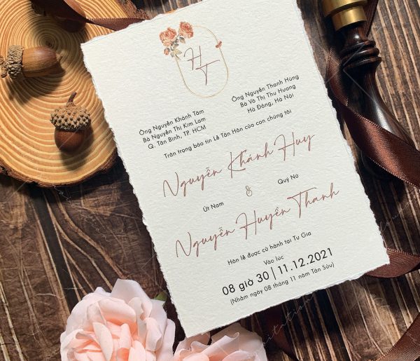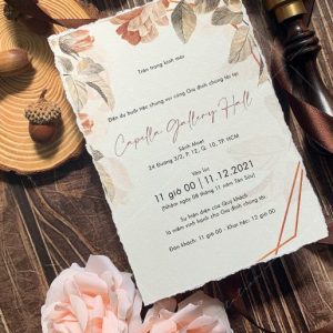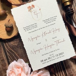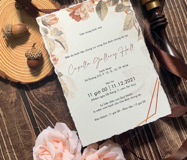 – Thiệp mời tiệc: 12 x 17 cm, quy cách in 2 mặt, chất liệu giấy mỹ thuật cao cấp. ( xé tay viền thiệp )