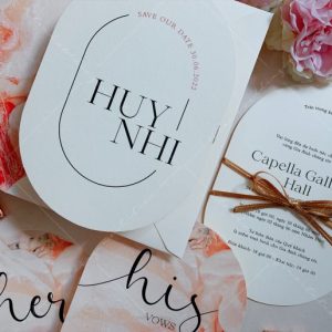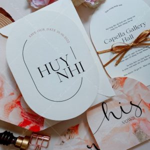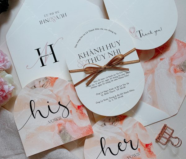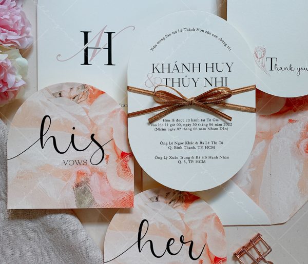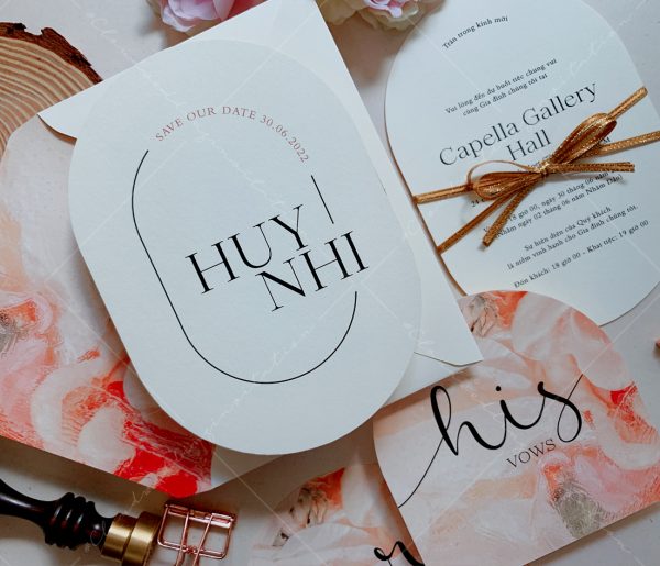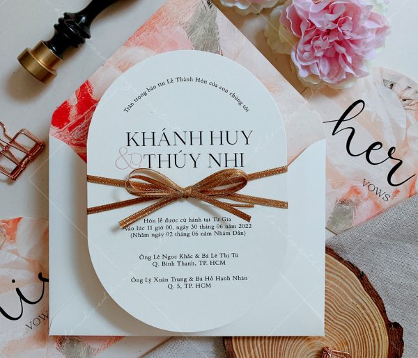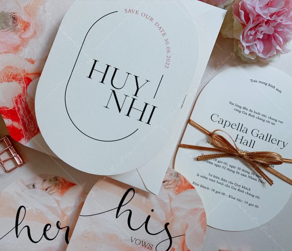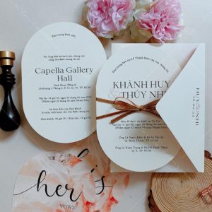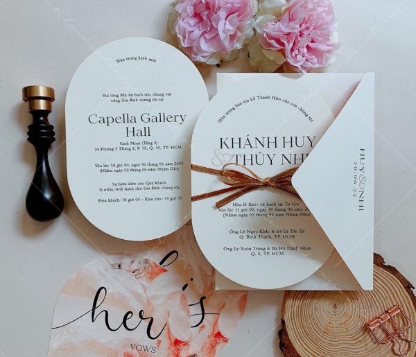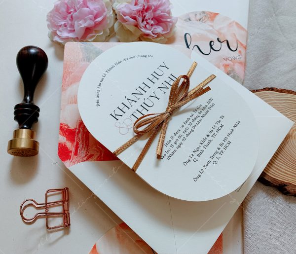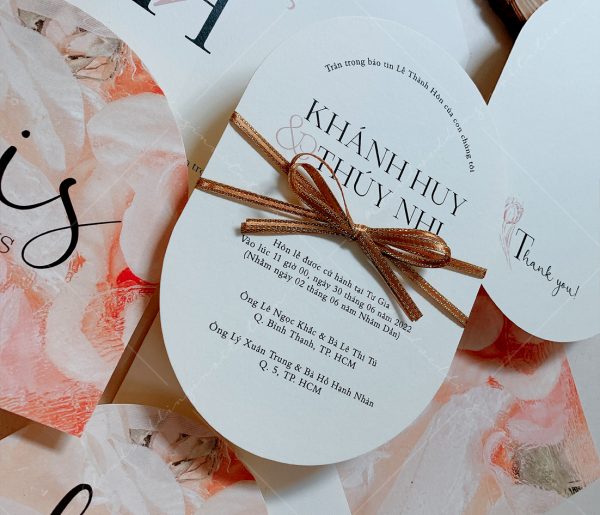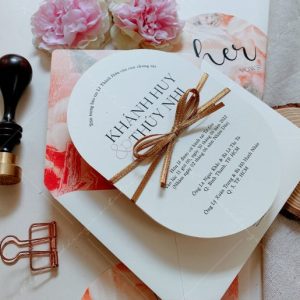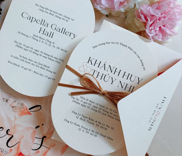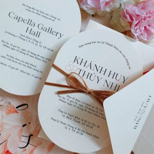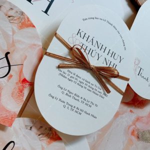 – Thiệp mời tiệc: 12 x 17 cm, quy cách in 2 mặt, bế bo tròn như hình, chất liệu giấy mỹ thuật cao cấp.