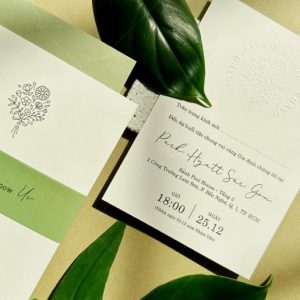 – Thiệp mời tiệc: 12 x 17 cm, quy cách in 2 mặt, chất liệu giấy mỹ thuật cao cấp.