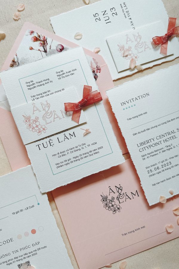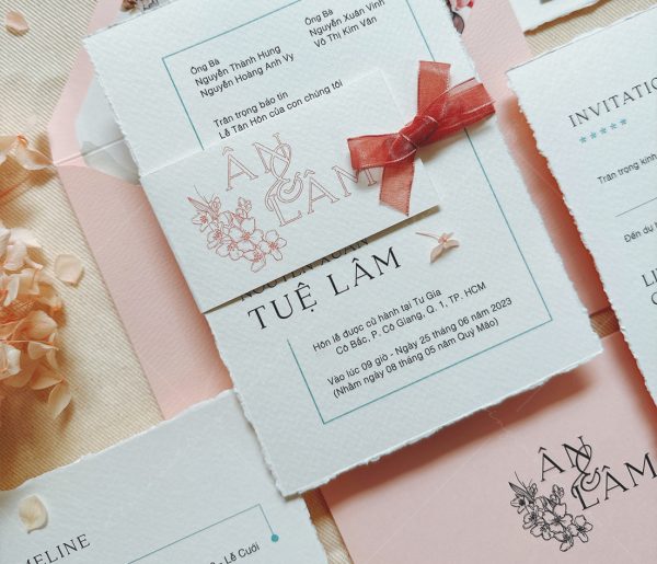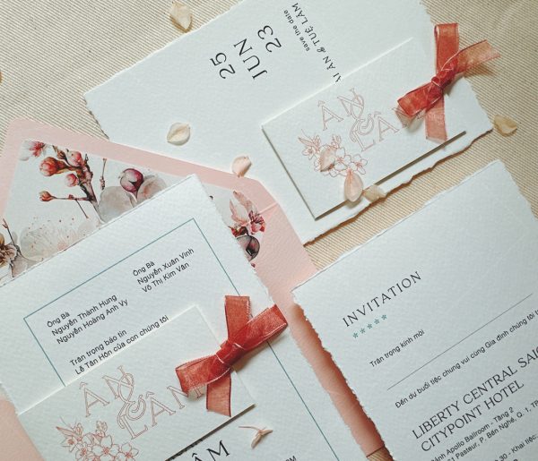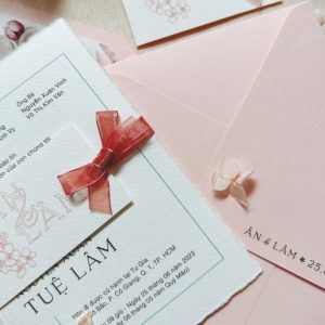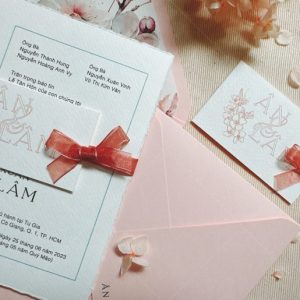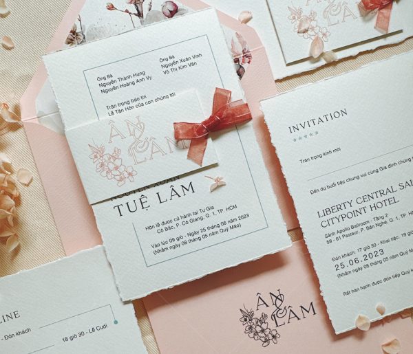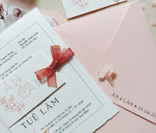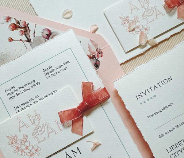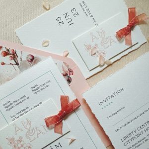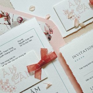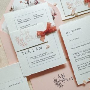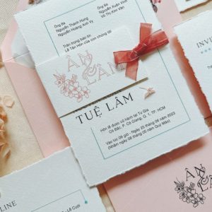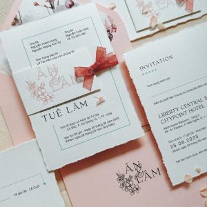 – Thiệp mời tiệc:12 x 17 cm, quy cách in 2 mặt, xé viền thiệp, chất liệu giấy mỹ thuật cao cấp.