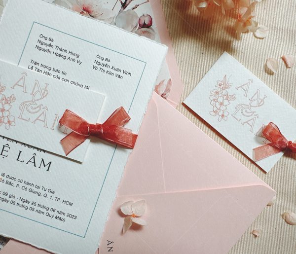 – Thiệp báo hỷ: 12 x 17 cm, quy cách in 2 mặt, xé viền thiệp, chất liệu giấy mỹ thuật cao cấp.